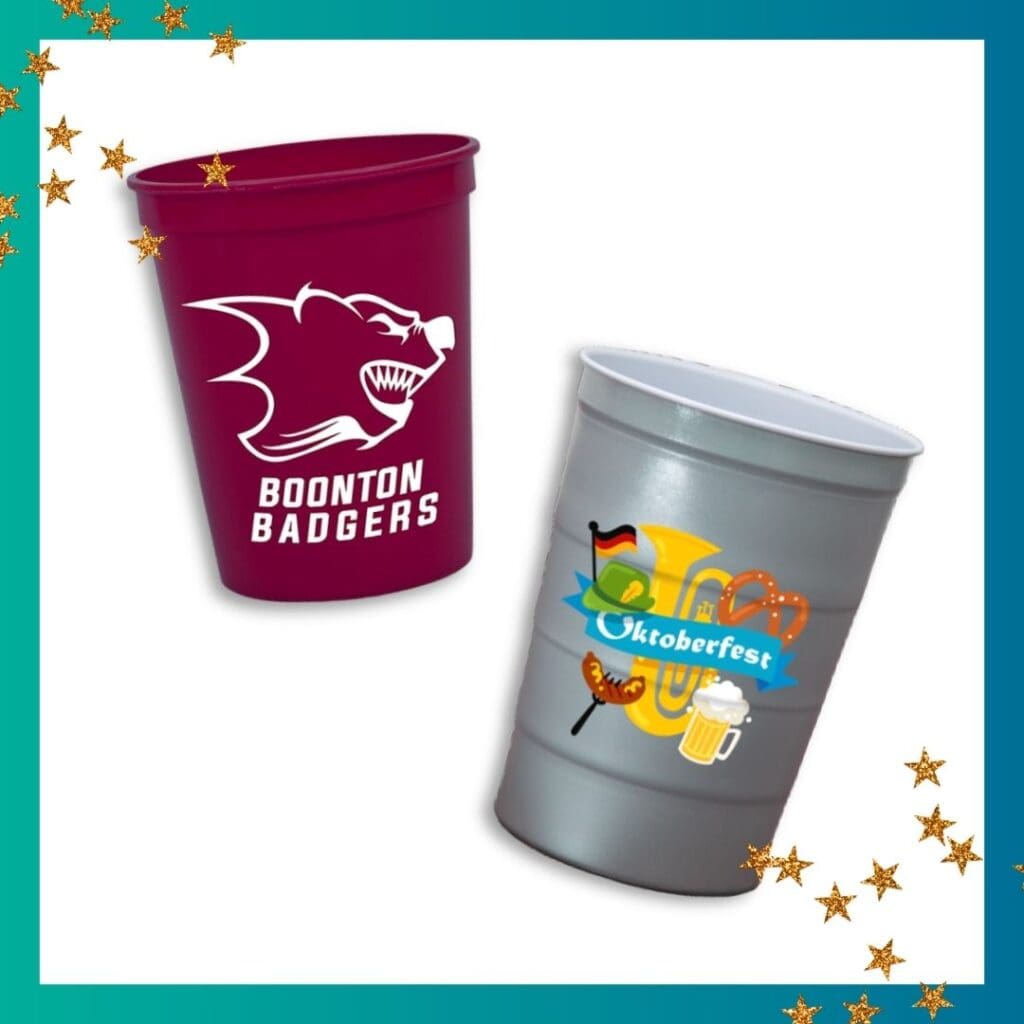 Cups continue to be an event staple because they are simple, functional, and easy to brand. They showed up often at athletic events, gatherings, and community festivals. Examples include stadium cups and plastic drinkware.